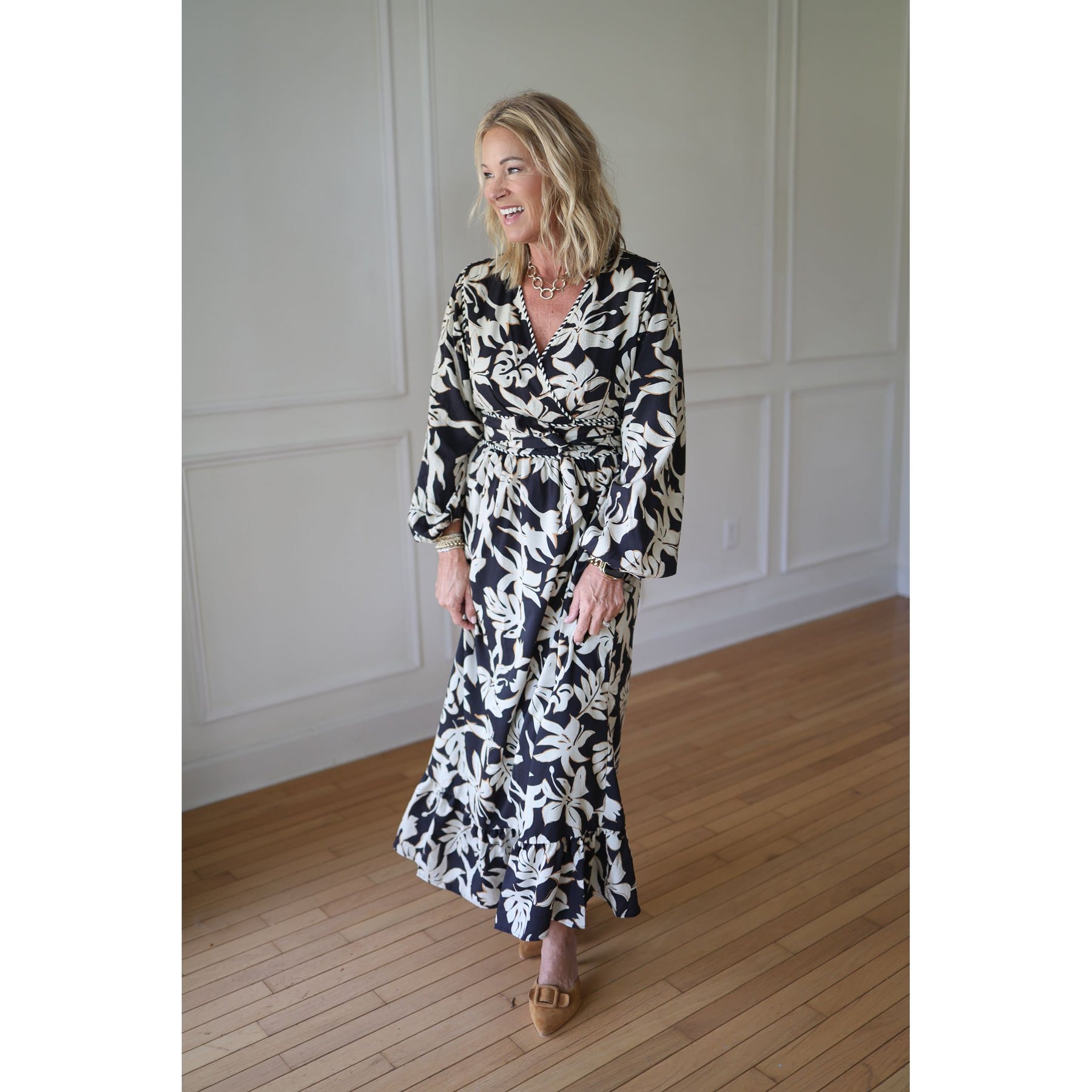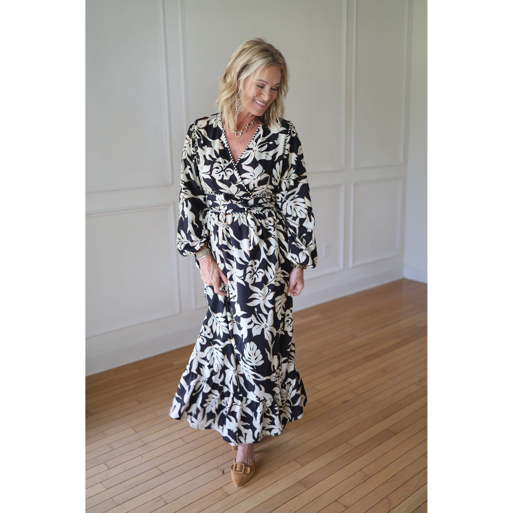 This playful Jenny Black Floral Wrap Maxi Dress features a charming taupe floral pattern set against a sleek black background, accented by stylish black and white stripe details. Designed with long sleeves and a comfortable lining, it offers both elegance and ease. Complete with handy pockets, this polyester dress effortlessly combines practicality with flirty flair for your next outing.