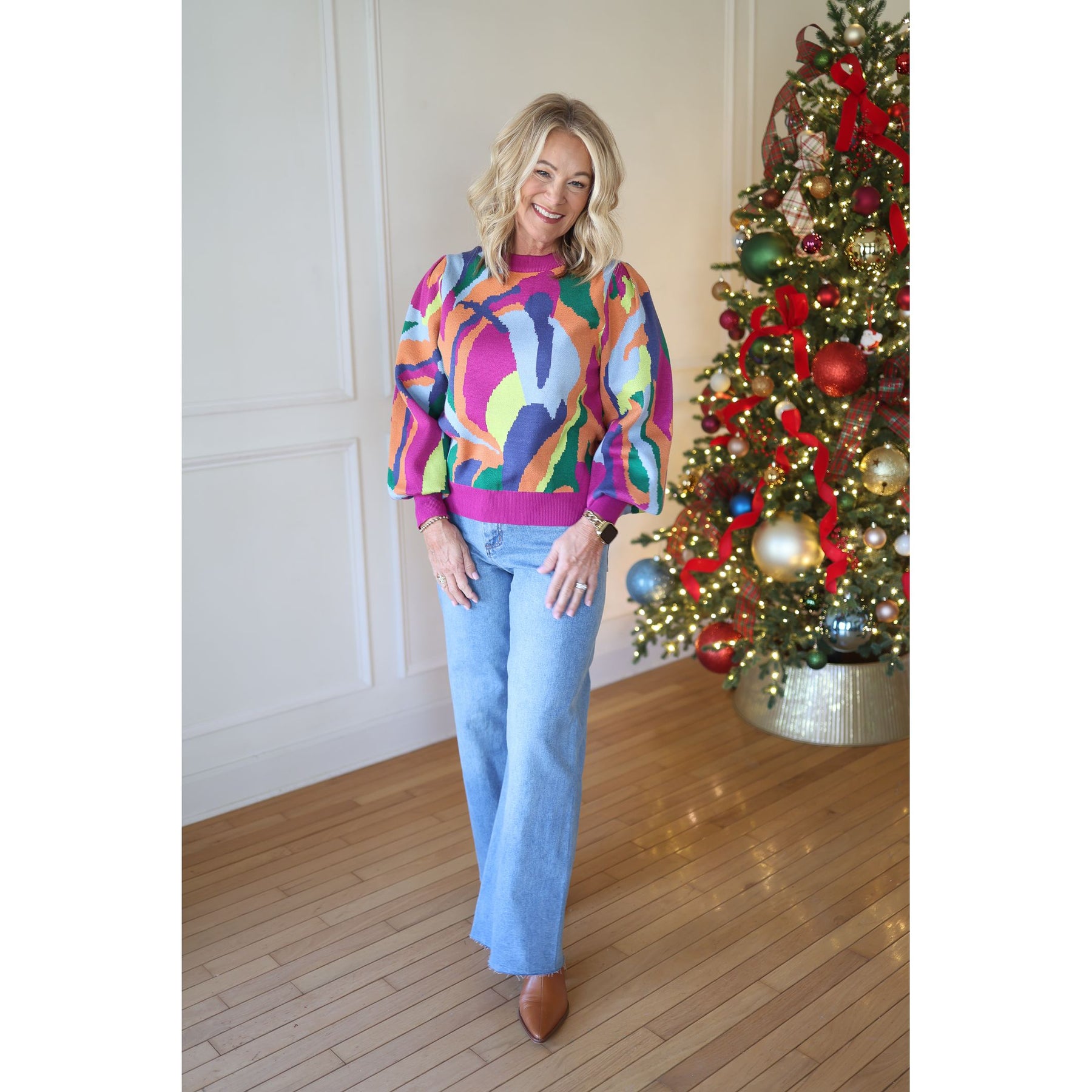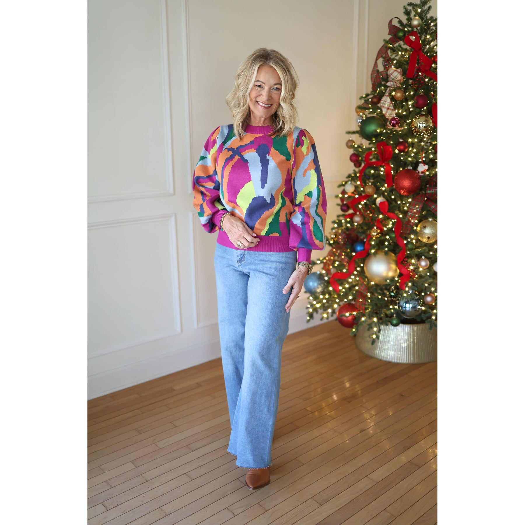 Add a splash of vibrant fun to your wardrobe with the Ana Magenta Sweater. Featuring a lively multi-color print over a bold magenta base, this long-sleeve sweater brings energy to any outfit. The round neck and banded hem and sleeves provide a snug, comfortable fit that’s perfect for playful days and cozy nights.]