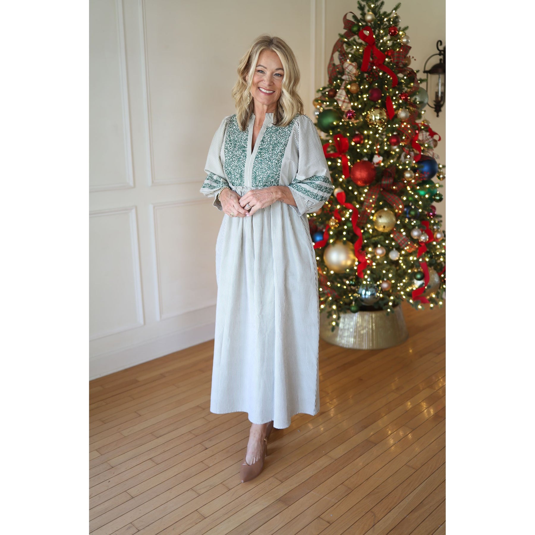 Woman in a white striped dress with green embroidery standing in front of a decorated Christmas tree.