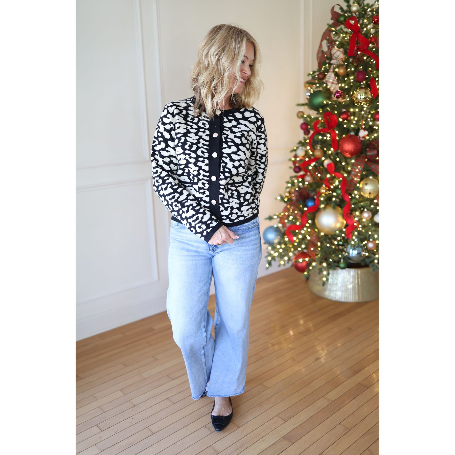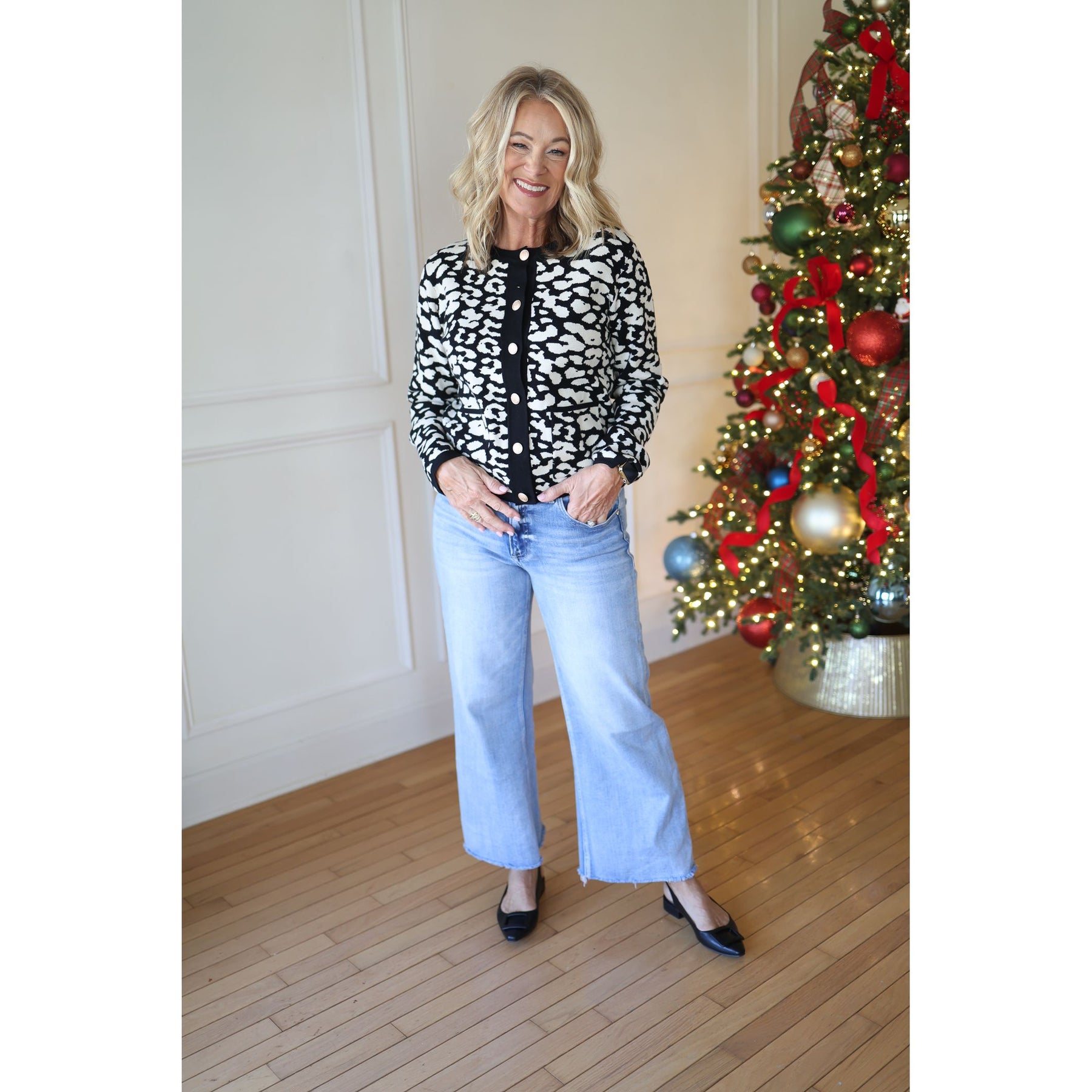Woman in a leopard print cardigan and jeans standing next to a decorated Christmas tree.