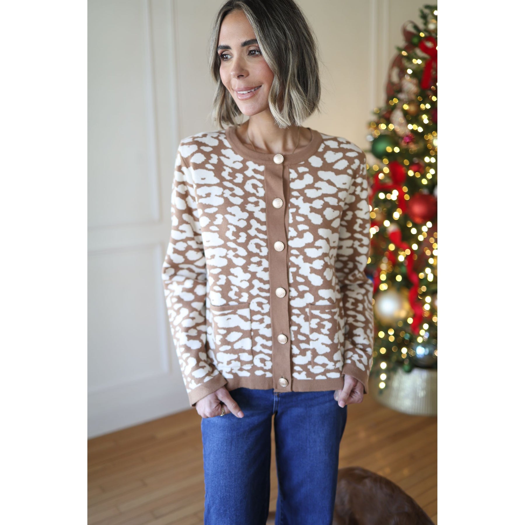 Add a pop of charm to your outfit with the Sophia Taupe Cardigan. This playful piece features a soft taupe base with delicate ivory prints and eye-catching gold buttons down the front. With the viscose, polyester and nylon blend and handy front pockets and a flattering scoop neck, it’s perfect for cozy days when you want to look effortlessly stylish.
