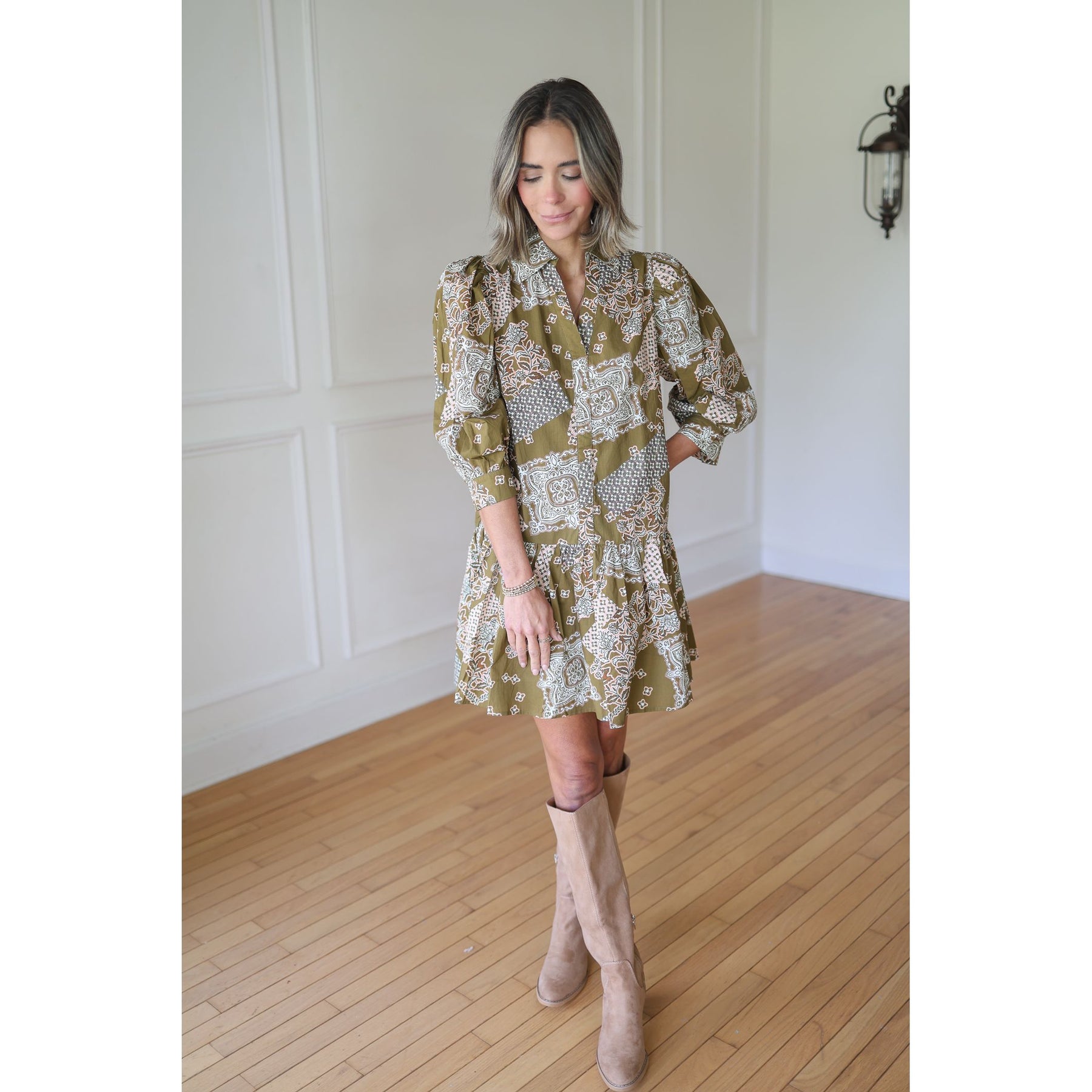 Woman in a patterned dress and knee-high boots