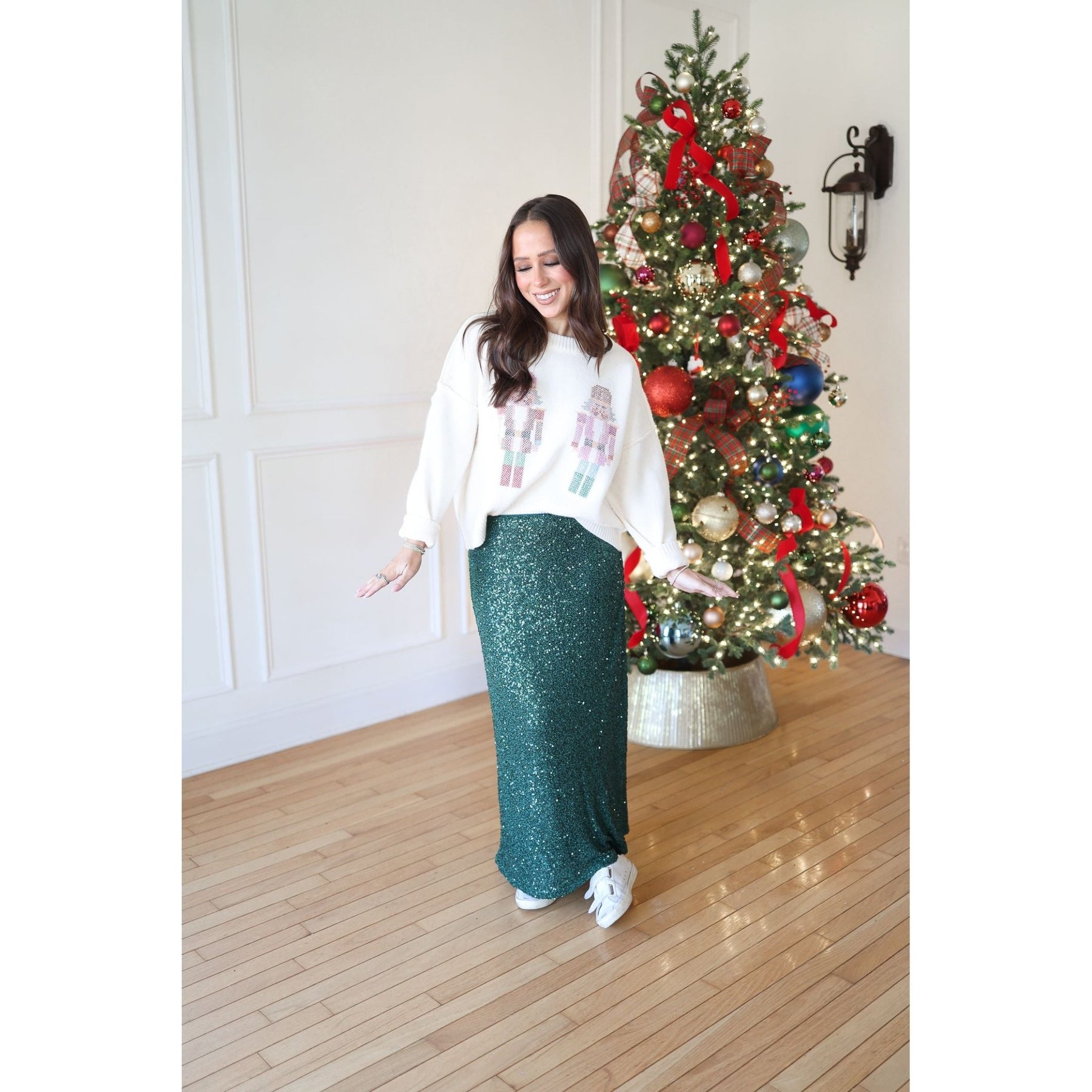 Elevate your seasonal wardrobe with this refined long-sleeve sweater, featuring a charming pastel nutcracker motif set against a soft ivory base. The classic round neckline and timeless design make it an effortless choice for layering or wearing solo. Perfect for adding understated elegance to your everyday style while celebrating the festive spirit with subtle sophistication.