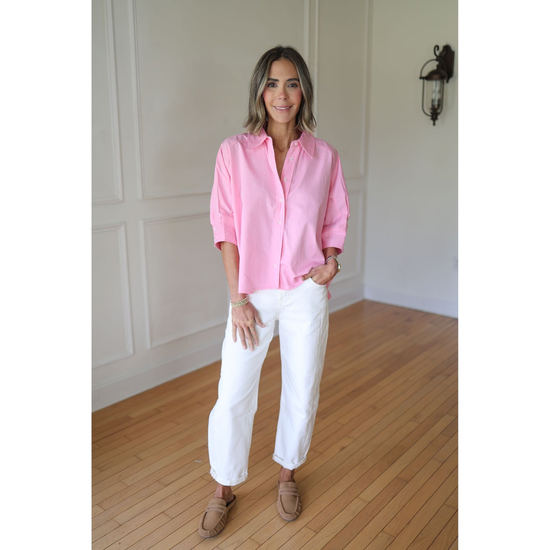 Skip to contentBring a splash of fun to your wardrobe with the Duncan Button Front Pink Top. Featuring a playful hibiscus pink shade, a classic collar, and flirty 3/4 length sleeves, this top boasts a slight high-low hem for a trendy twist. The button-front detail adds charming flair, perfect for casual days or spirited nights out.