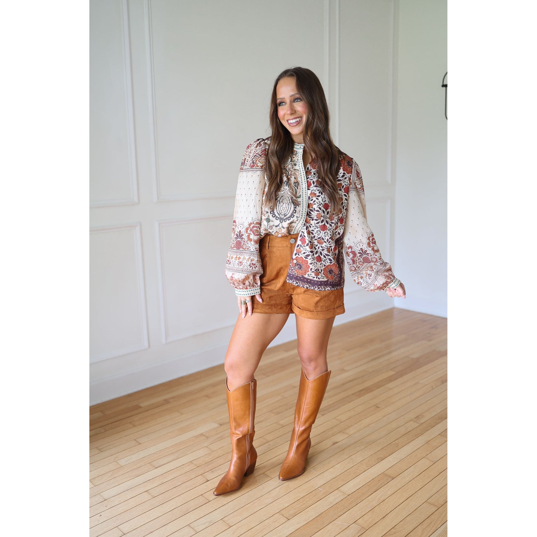 Woman wearing a floral blouse, brown shorts, and knee-high boots