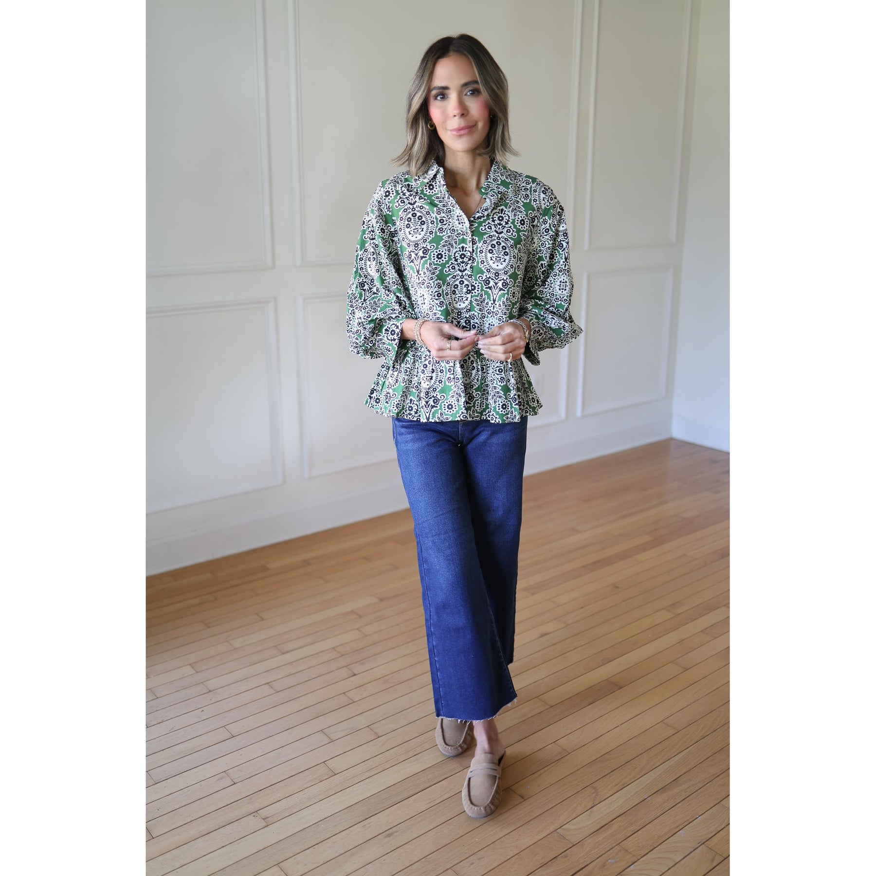 Brighten your wardrobe with the Tabor Green Floral Blouse, featuring a lively green base adorned with black and white floral prints. Its playful design includes 3/4 length sleeves, a button-front closure, and a classic collar. The charming ruffle hem adds a flirty touch perfect for day or night. This blouse pairs effortlessly with jeans or skirts for a fun, fresh look.