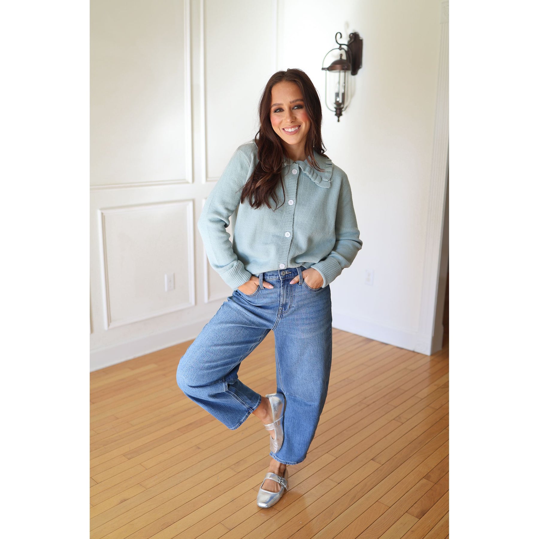 Add a touch of whimsy to your wardrobe with the Elsa Collared Button Up Sweater. Featuring a charming Peter Pan collar and a classic button-up front, this cardigan is perfect for layering in cream or mint shades. Cozy yet playful, it pairs effortlessly with your favorite outfits to brighten any day.