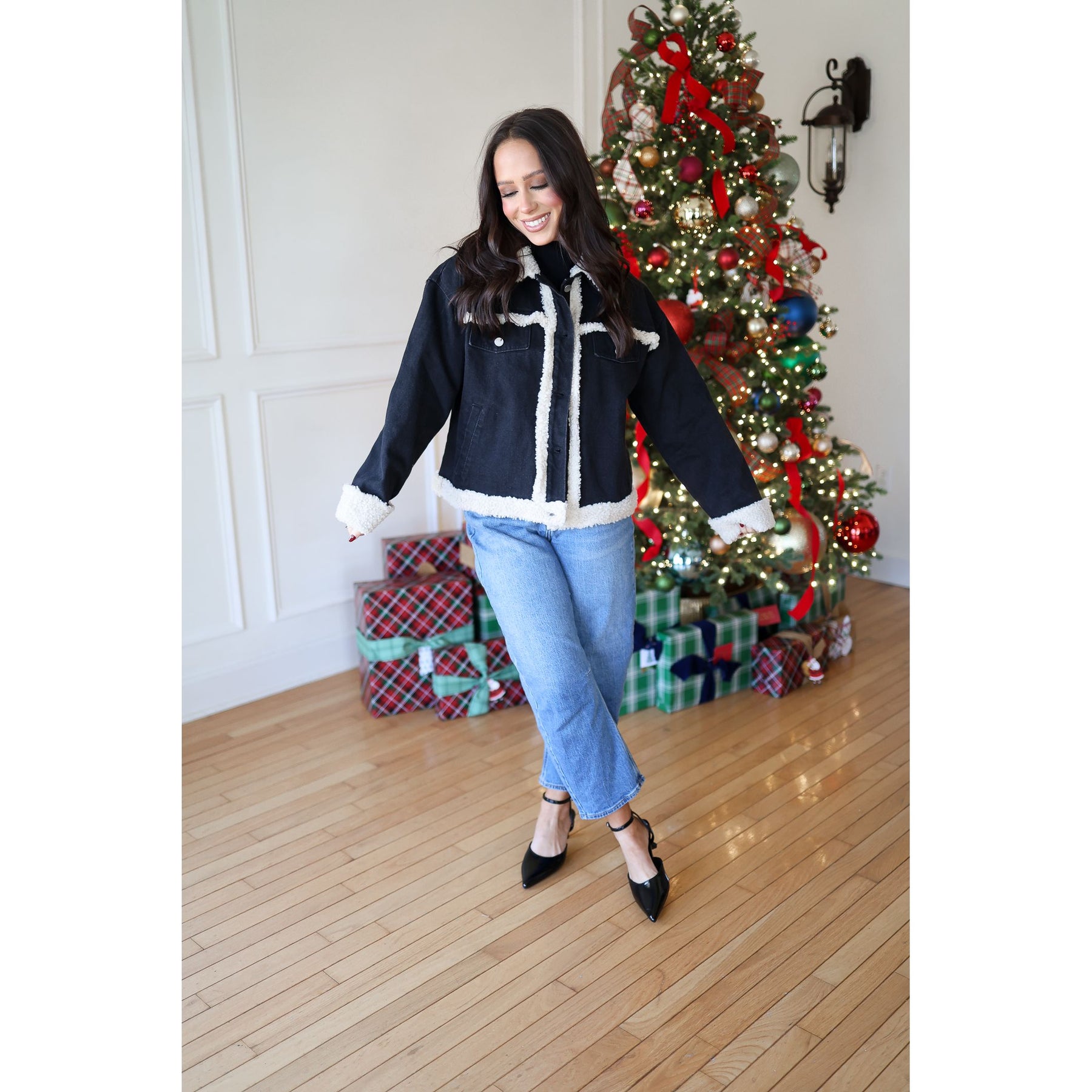Elevate your denim essentials with the Elsie Black Fur Detail Denim Jacket. This refined piece combines classic black denim with luxurious white fur detailing for an understated yet striking aesthetic. Functional front chest pockets with button closures and traditional front pockets offer practical style, while the button-front design ensures effortless layering. Perfect for transitional seasons or as a polished outerwear staple that pairs seamlessly with both casual and elevated looks.