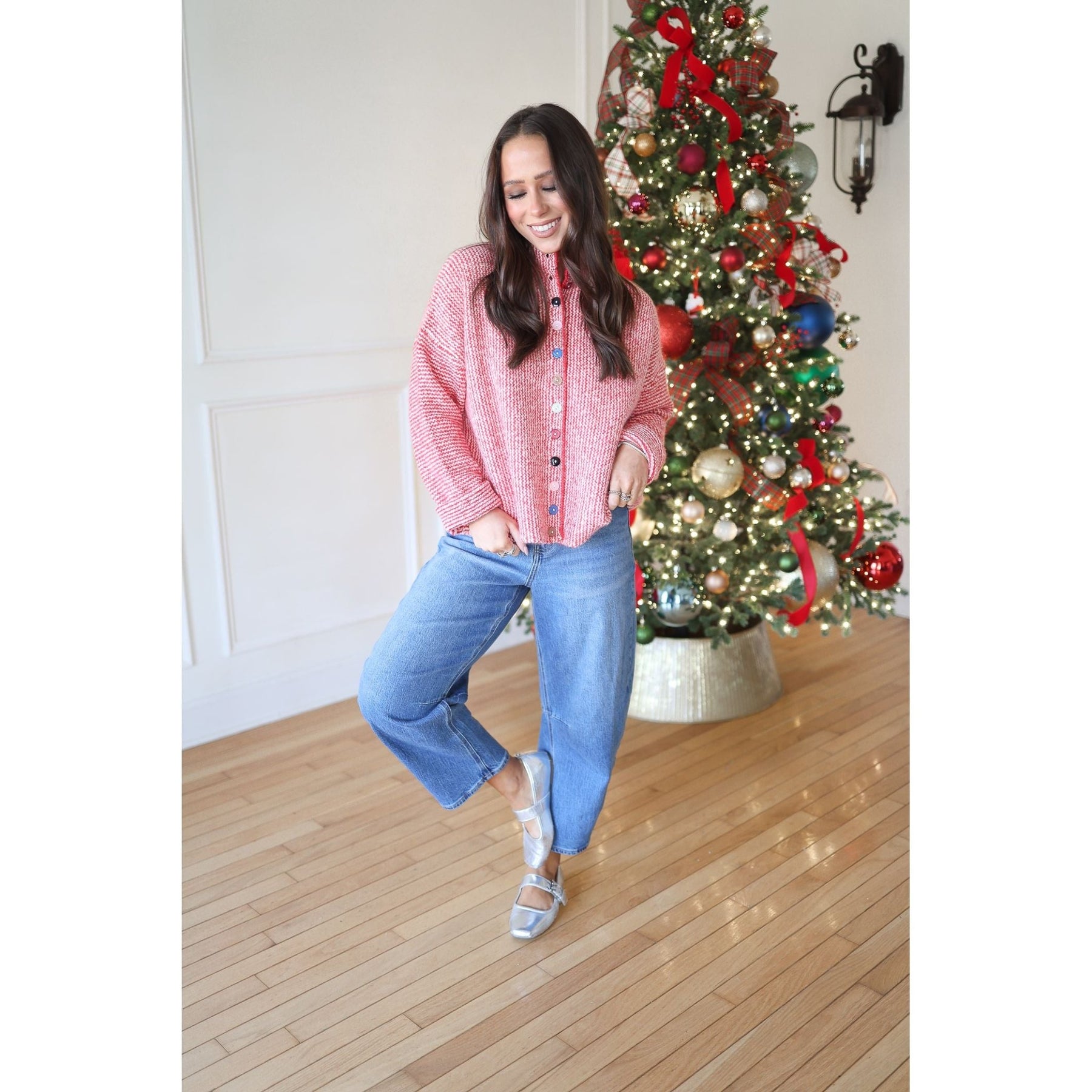The Shaylee Red Striped Cardigan features elegant red and ivory stripes complemented by a variety of unique buttons along the front. Designed with a refined mock neck, this button-front cardigan effortlessly blends classic style with modern details, making it a sophisticated addition to any wardrobe.