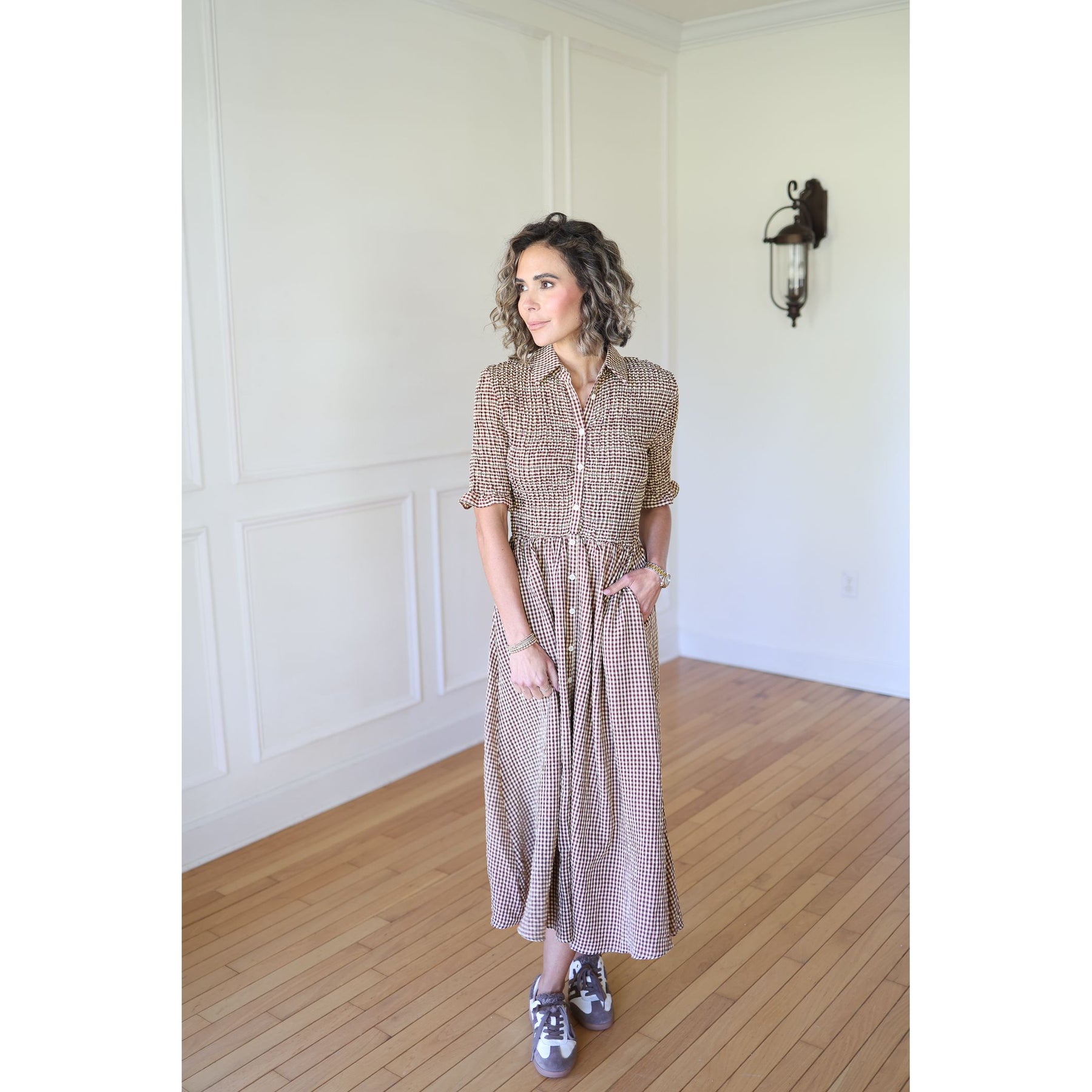 Skip to contentStep into effortless charm with the Deedee Mocha Gingham Midi Dress. Featuring a playful tan and mocha gingham pattern, this collared dress offers a button-front design and a flattering midi length. The elastic top ensures a comfortable fit that moves with you, perfect for anything from brunch dates to strolls in the park. Embrace laid-back style with a fun twist!