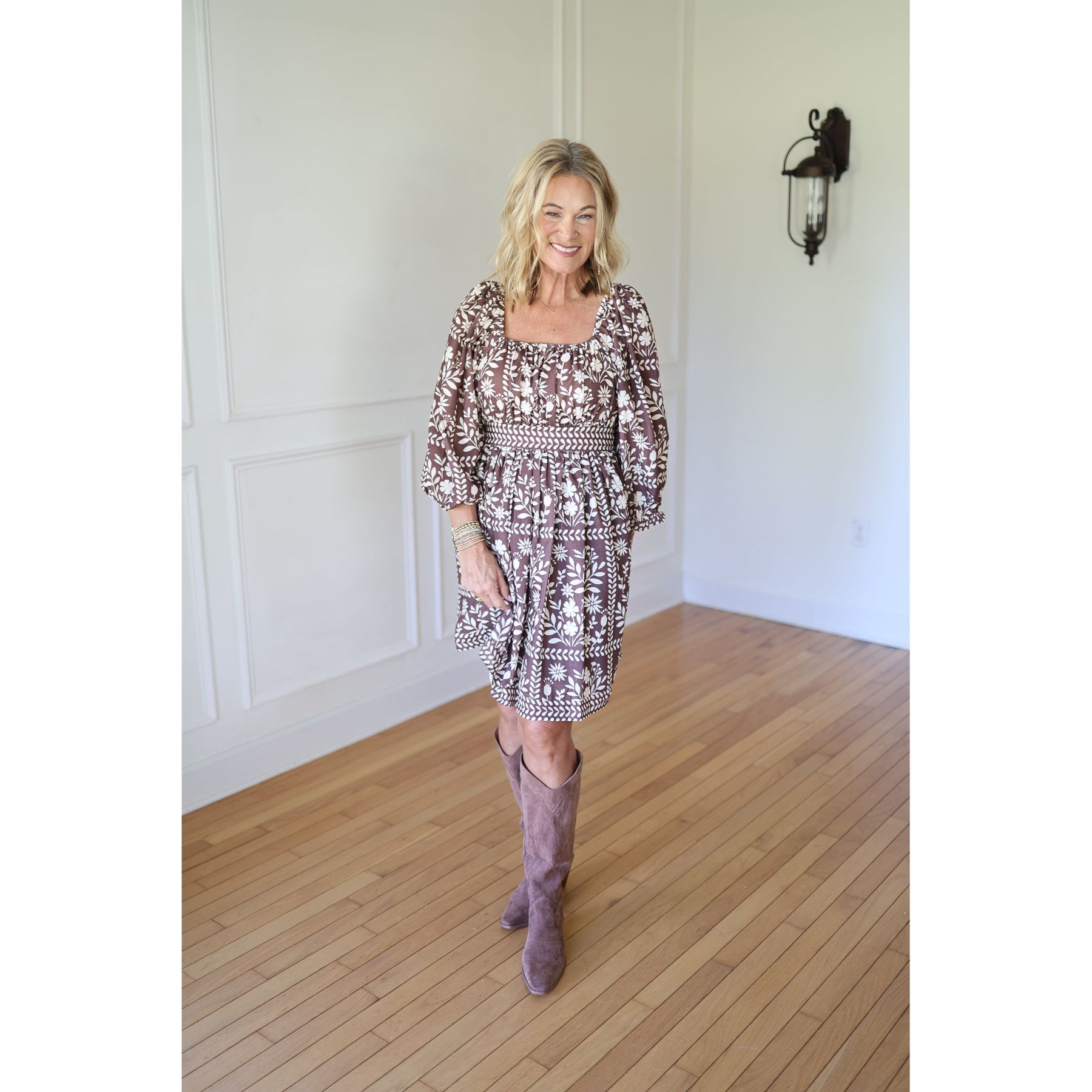 Skip to contentStep into charm with the Keely Brown Floral Mini Dress, featuring a playful square elastic neckline that adds a fun twist to your look. The tie waist lets you shape your silhouette exactly how you like, while the delicate brown and ivory floral pattern brings a touch of whimsy. Long sleeves keep it cozy, and a smooth lining ensures comfort all day or night. Perfect for twirling through your day with effortless style! 100% polyester