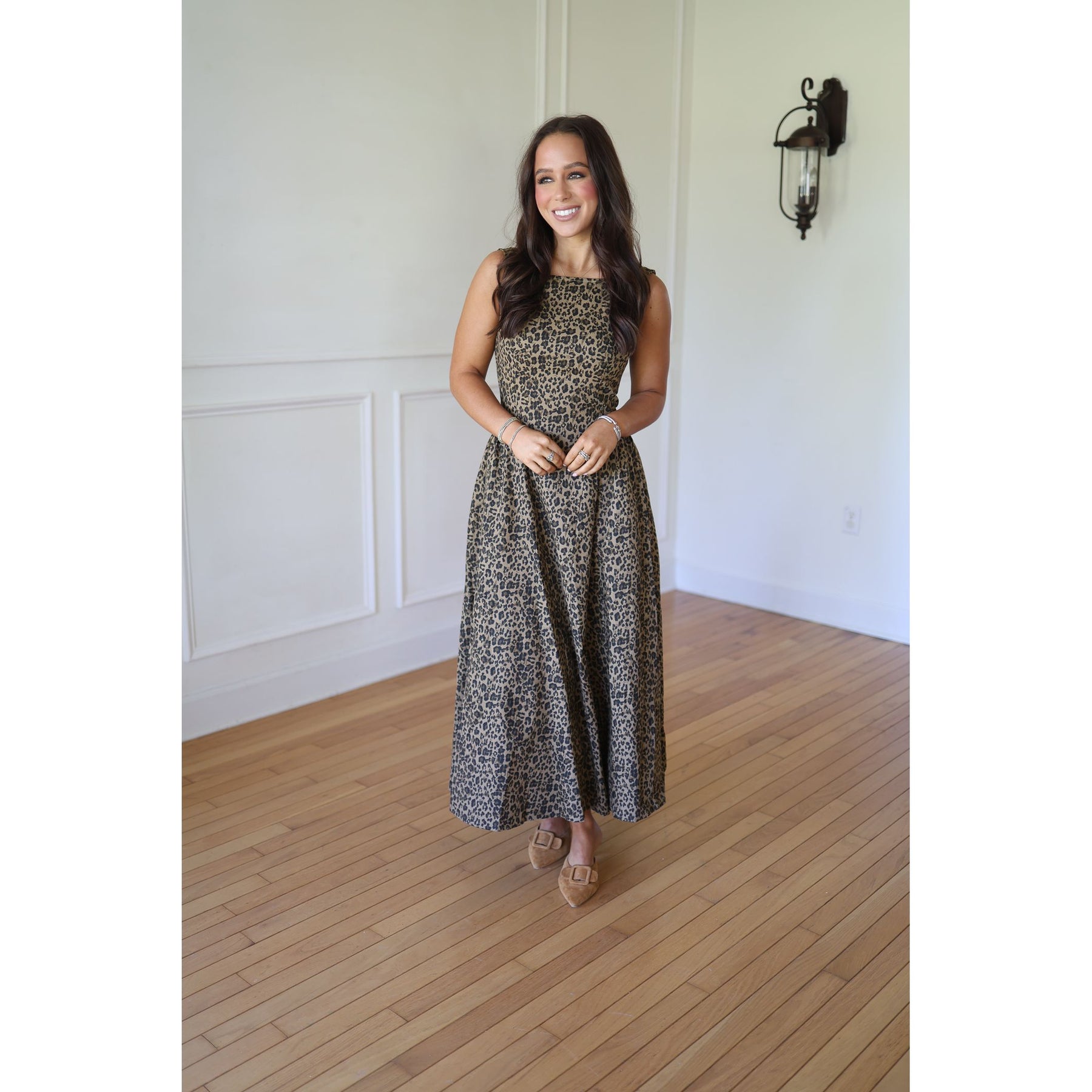 Turn heads with the Kristen Leopard Midi Dress, featuring a chic U-shaped boat neck and playful sleeveless flare silhouette. The bold leopard print adds a wild touch to this cotton midi-length dress, perfect for making a stylish statement wherever you go. Embrace confidence and comfort with this effortlessly flirty design.