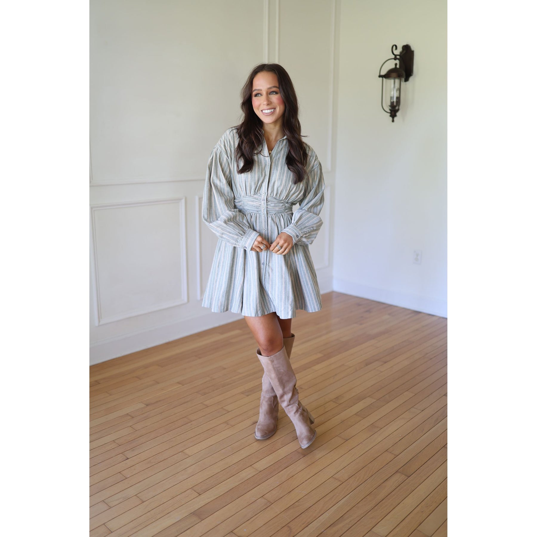 Step into playful charm with the Madden Olive Multi Striped Mini Dress. Featuring a crisp collar and a button-front design, this cotton dress combines casual ease with a touch of sophistication. The drop long sleeves and ash olive stripes give it a fresh, flirty vibe perfect for day-to-night wear. Its mini length adds a fun, youthful edge that keeps your look effortlessly stylish.