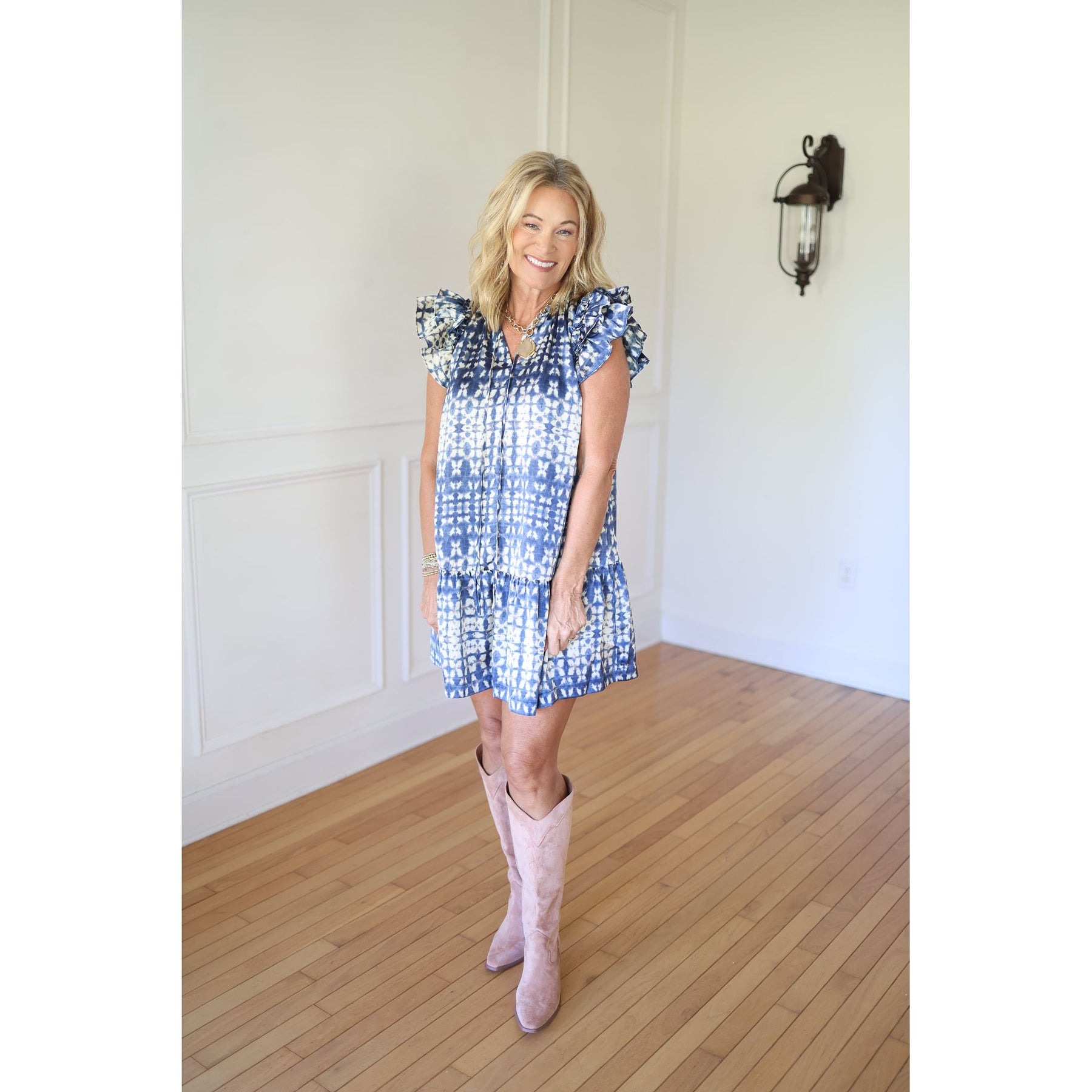 Elevate your wardrobe with the Arianna Dusty Navy Mini Dress, featuring a delicate dusty blue and ivory print on 100% tencel silky fabric. This sophisticated piece is detailed with a ruffle tie neck, short ruffle sleeves, and a ruffle hem, adding graceful movement and charm. Fully lined for comfort, it effortlessly blends elegance with feminine flair, perfect for refined occasions or stylish everyday wear.