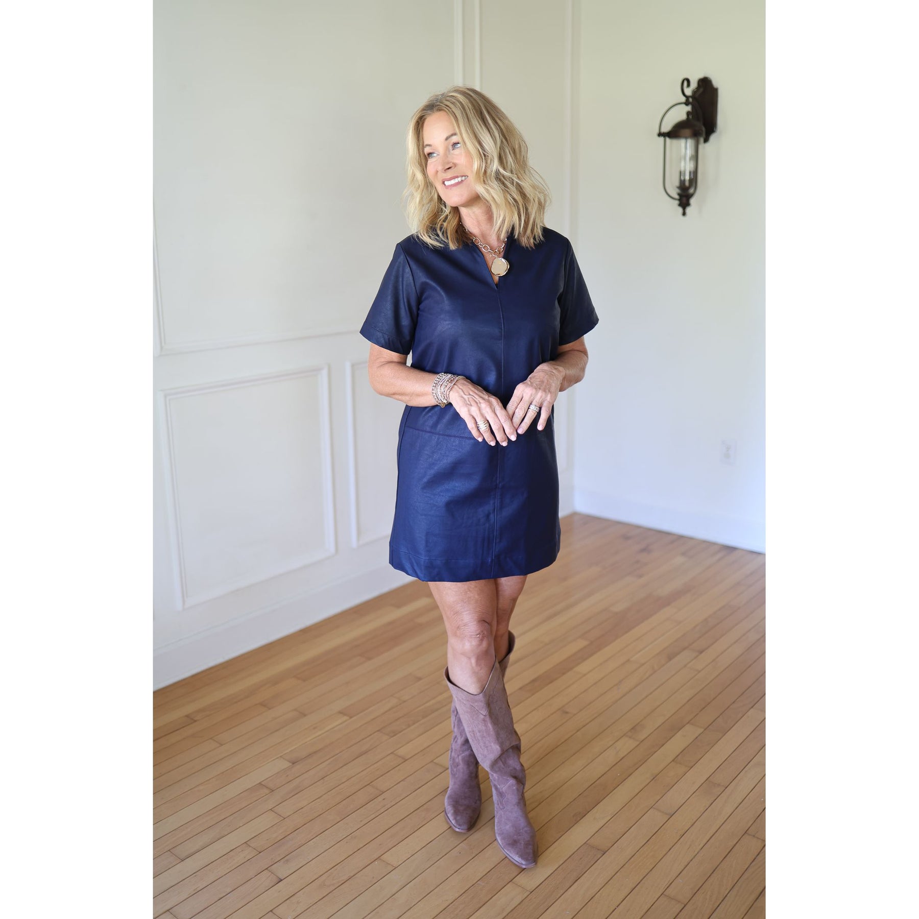 Skip to contentThis playful Shanea Navy Leather Tunic Mini Dress features a chic collared V-neck and short sleeves, blending edgy leather with a breezy tunic silhouette. Fully lined for comfort, its navy shade adds a cool twist to your wardrobe, perfect for making a bold statement with effortless style.